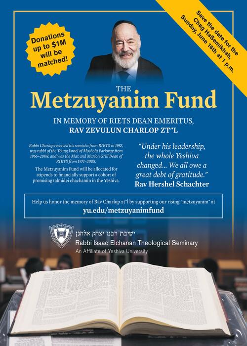 Our Dean Emeritus, Rabbi Zevulun Charlop Zt"l, was a pillar of the RIETS community for decades and aided countless talmidim (or, as he would say, "metzuyanim") on their path to becoming rabbanim. As we prepare to celebrate the Chag HaSemikhah, we are privileged to establish the Metzuyanim Fund in his memory to financially support a yearly cohort of promising talmidei chachamim learning in our kollel. Thanks to a generous donor, contributions will be matched up to $1 million! Please consider supporting our rising metzuyanim in order to continue the tradition of excellence and success in learning that Rabbi Charlop embodied. Donations can be made at https://fr.3ojfh.shop/MetzuyanimFund